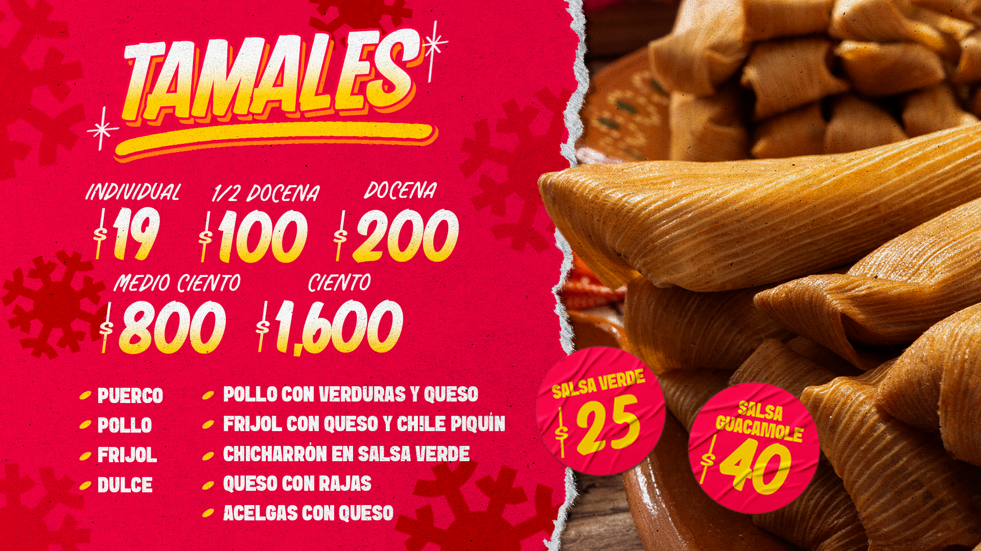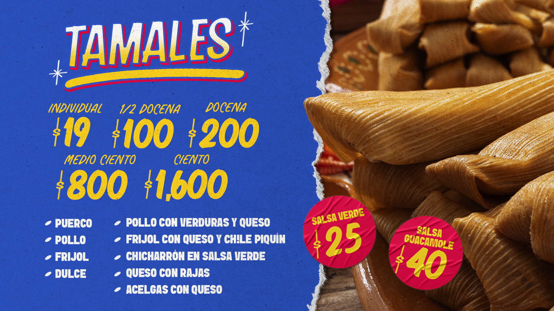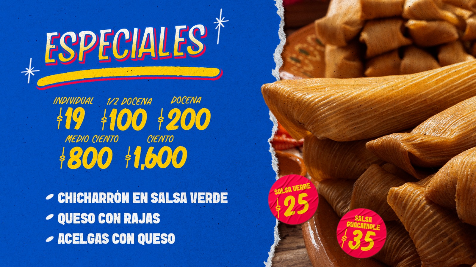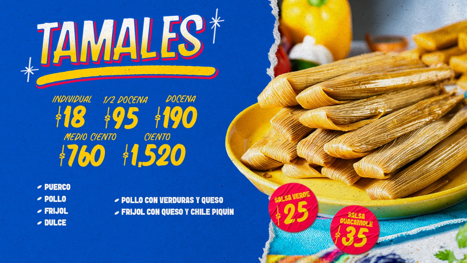 Carne de Puerco, Pollo, Frijol, Chicharrón, Pollo con Queso y Verduras, Acelgas con Queso, Queso con Rajas, Frijol con Queso y Chile Piquín y Tamales de Dulce.