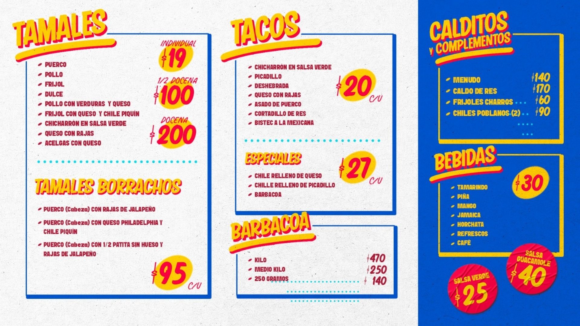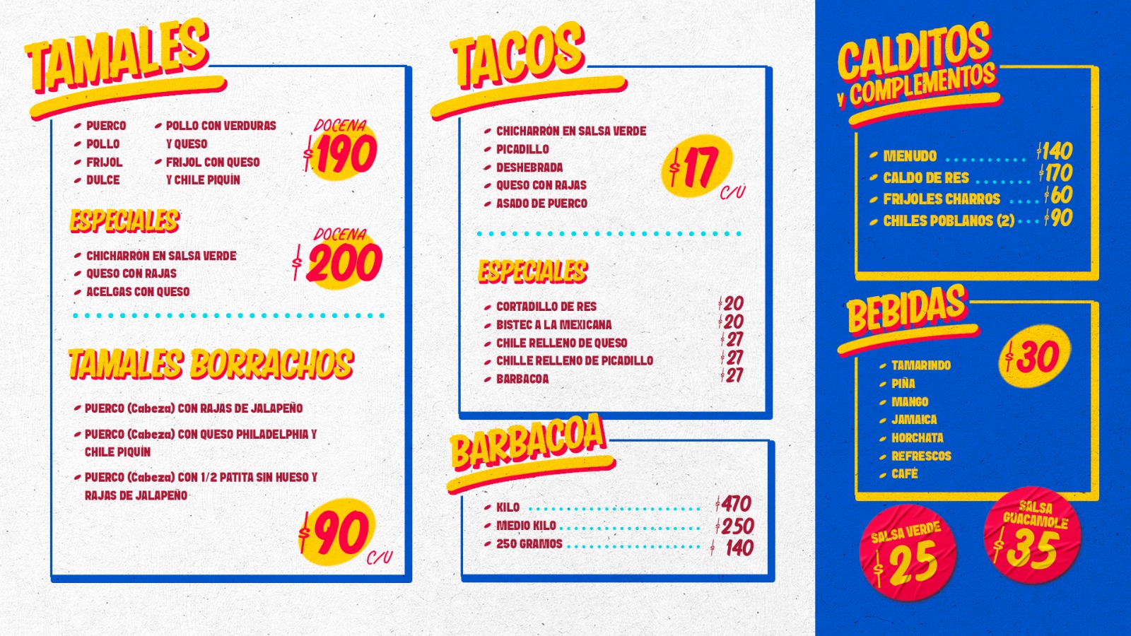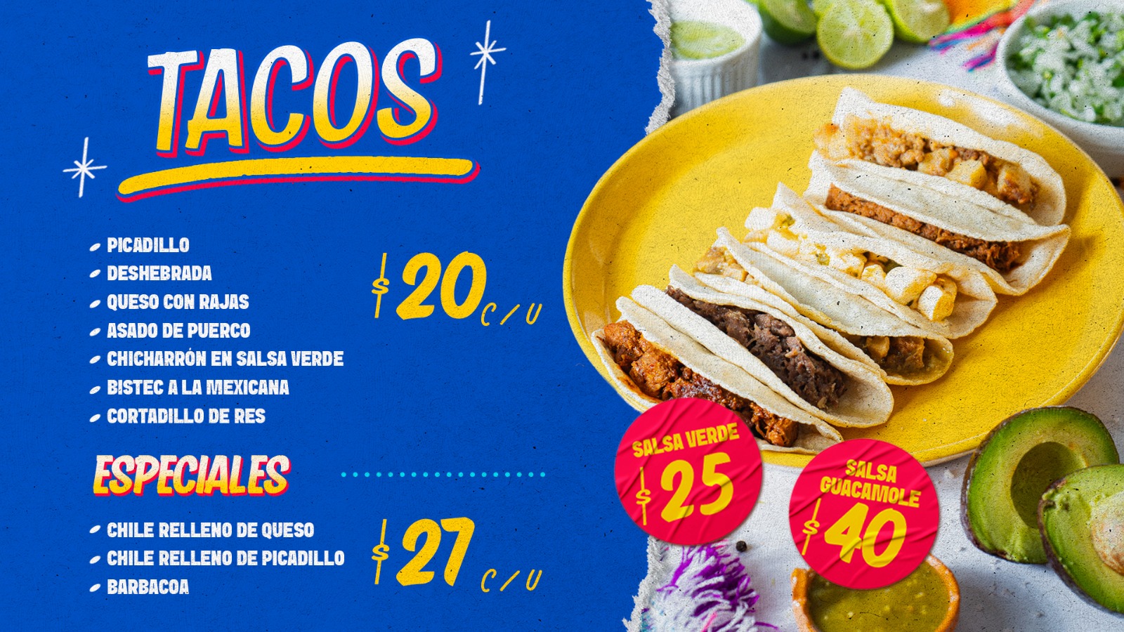 Menudo, Taquitos de Guisos: Chicharrón en Salsa Verde, Deshebrada, Picadillo, Barbacoa, Queso con Rajas, Chiles Rellenos de Queso y de Picadillo .