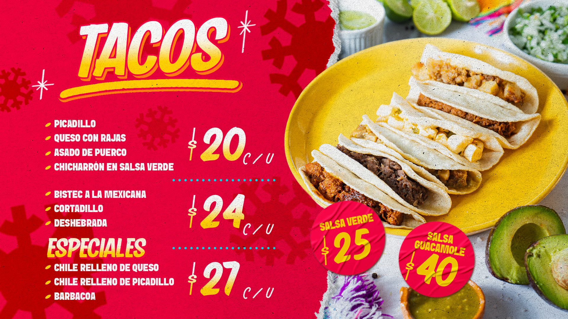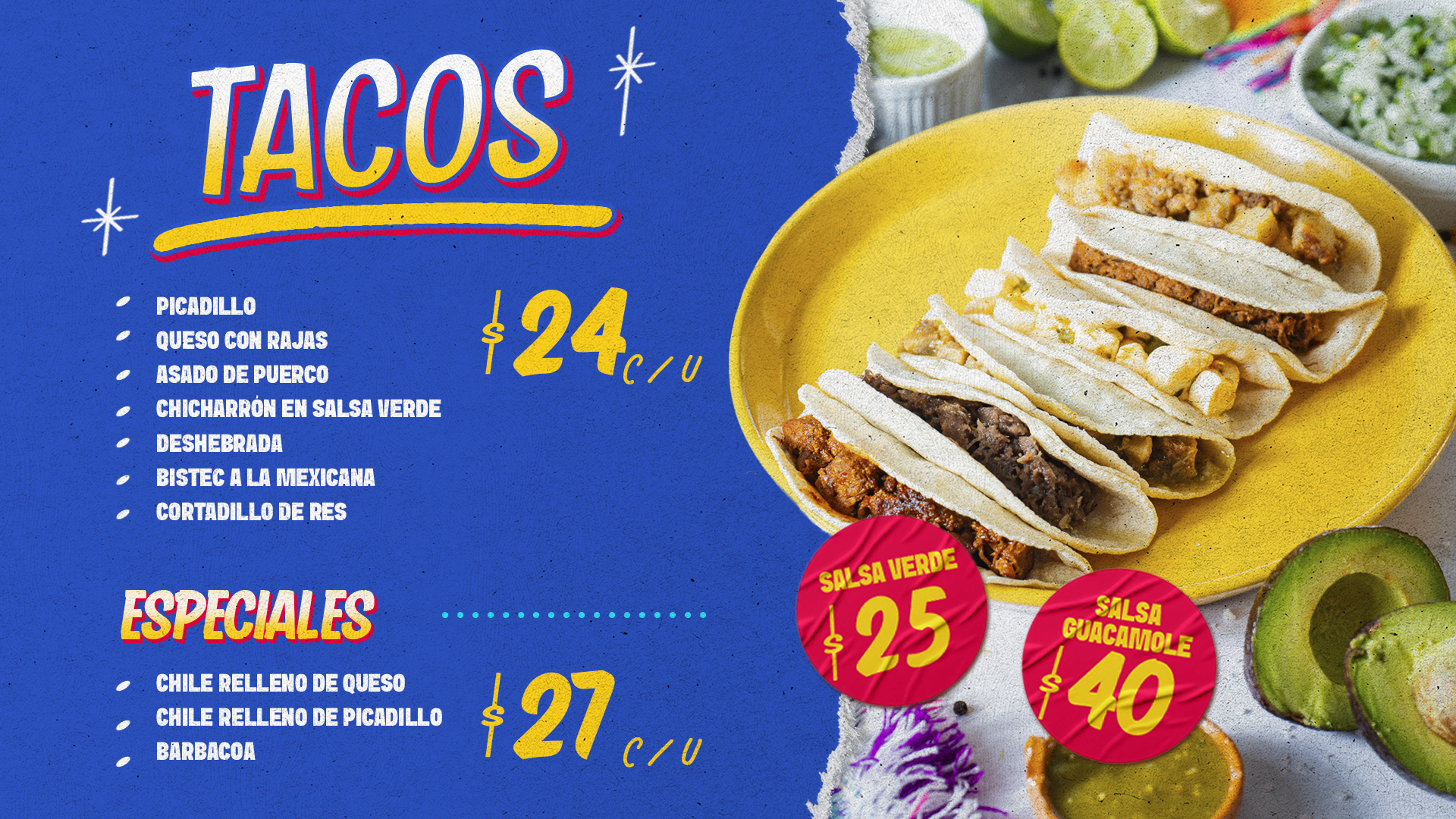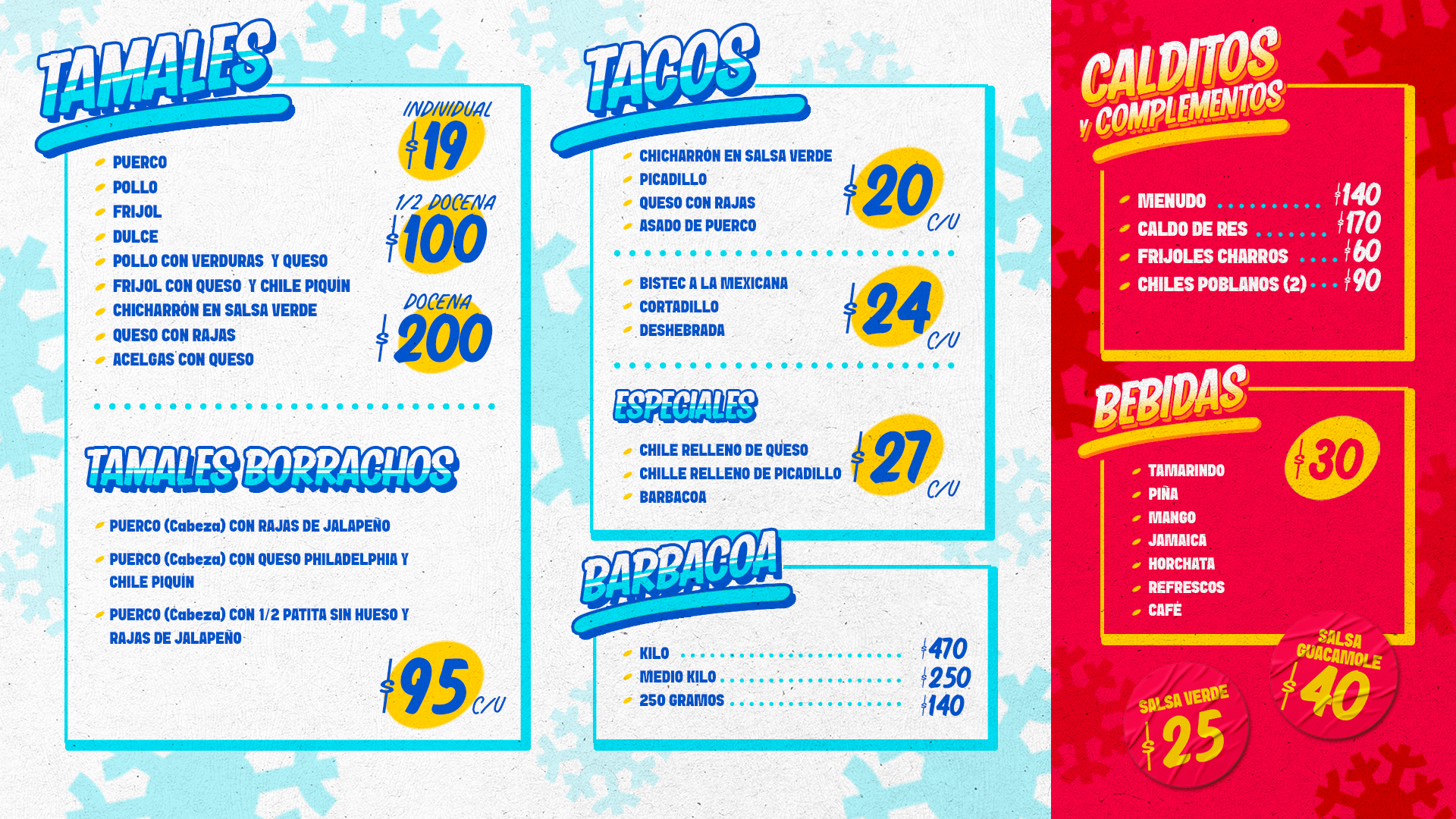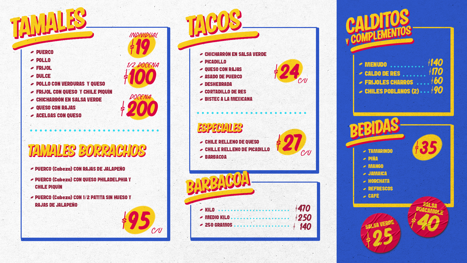 Menudo, Taquitos de Guisos: Chicharrón en Salsa Verde, Deshebrada, Picadillo, Barbacoa, Queso con Rajas, Chiles Rellenos de Queso y de Picadillo .